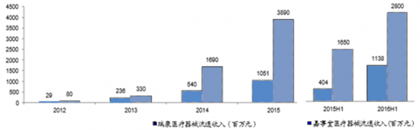 過(guò)去幾年來(lái),特別是2013年開(kāi)始,瑞康醫(yī)藥、嘉事堂大力整合骨科、心內(nèi)科等高 值耗材經(jīng)銷(xiāo)商,醫(yī)療器械流通收入迅速增加,2012年兩家公司高值耗材收入不足1億元,2015年嘉 事堂高值耗材收入達(dá)39億元,瑞康高值耗材流通收入達(dá)10億元,2016H1瑞康器械和高值耗材流通 收入達(dá)11.38億元,同比增長(zhǎng)182%,嘉事堂器械和高值耗材流通收入超過(guò)28億,同比增70%,成 為公司主要增長(zhǎng)點(diǎn)。