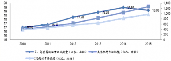2015年高值耗材市場(chǎng)規(guī)模達(dá)1246億元,增長(zhǎng)22%,IVD試劑市場(chǎng) 達(dá)1000億元,增長(zhǎng)21%,而同期Ⅱ、Ⅲ類(lèi)器械經(jīng)營(yíng)企業(yè)數(shù)量首次下降了2%,降到 18.63萬(wàn)家,行業(yè)集中度得到提升,以后“兩票制” 等政策壓力下行業(yè)整合將會(huì)加速。