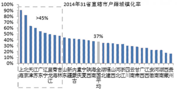 2014 年全國僅 9 個省直轄市戶籍城鎮化率超過 45%,剩余省市以三線城市為主