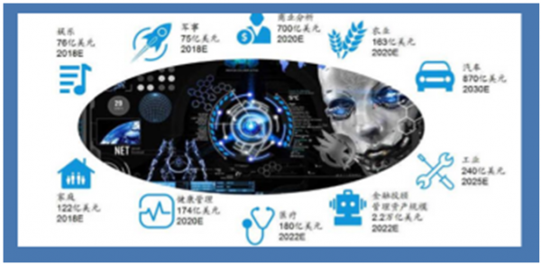 AI人工智能可廣泛應(yīng)用于汽車、娛樂、金融、教育、醫(yī)療、制造業(yè)、交通等各行 各業(yè),這些重構(gòu)的領(lǐng)域之多、力度之大將是前所未有的,在這背后蘊(yùn)藏的是 AI 無限想 象的市場空間。國內(nèi)外眾多機(jī)構(gòu)紛紛對 AI 在各行各業(yè)巨大的潛力進(jìn)行了預(yù)測,結(jié)果顯 示 AI 具有極其強(qiáng)大的應(yīng)用潛力。