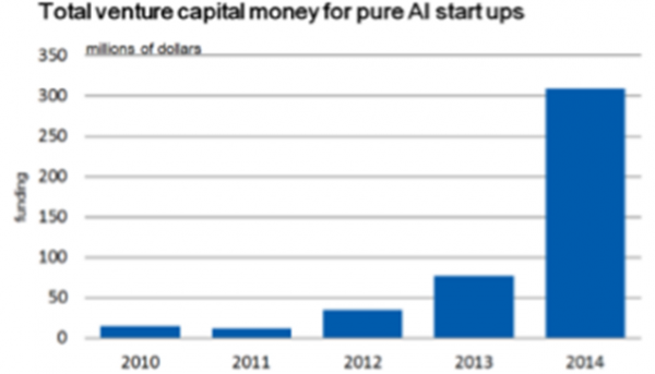 2010-2014 年全球人工智能領(lǐng)域風(fēng)投總額(百萬美金)