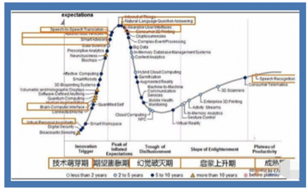 目前人工智能大多數(shù)子領(lǐng)域處于時(shí)間短于 5 年 的技術(shù)萌芽期和期望膨脹期。如自然語言問題回答、語音機(jī)器翻譯實(shí)時(shí)演示、智能預(yù)測 與建議、自動(dòng)駕駛等還處于發(fā)展時(shí)間在 2 年至 5 年之間的膨脹期,計(jì)算機(jī)腦交互、虛擬 個(gè)人助手等處于時(shí)間短于 2 年的萌芽期。