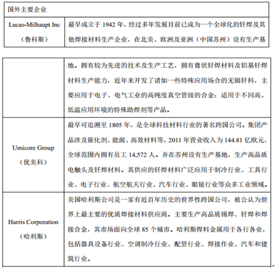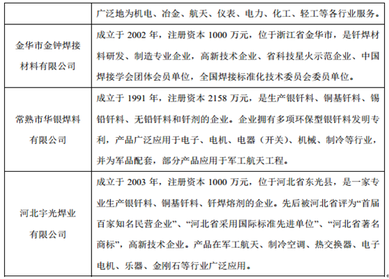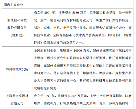 根據北京埃森焊接與切割展覽會1編制的《展會綜合技術報告》( 2011 版)信息, “目前,國內有色焊材生產處于集中與零散共存狀態,大型企業年產值超過5 億元,小企業年產值幾萬元。 ……銅鋁焊材、軟硬釬料產量約 16.3 萬噸,其中硬釬料品種約 500 種,規格約 3000 種,年產量約 3.5 萬噸……近幾年,硬釬料扮演著有色焊材大家庭中最活躍最有生命力的角色。主要硬釬料生產企業包括:杭州華光焊料有限公司、金華市金鐘焊接材料有限公司、金華信和焊接材料制造有限公司、常熟華銀焊料有限公司、江西金世紀特種焊接材料有限公司、上海斯米克焊材有限公司、上海申澳有色焊材有限公司、鄭州機械研究所、河北宇光焊業有限公司、廣東中山市華中金屬焊料有限公司、昆明貴金屬研究所、三一重工和中國人民銀行的幾家造幣廠等。 其中, 杭州華光和金華信和的年產量超過 2000噸……”