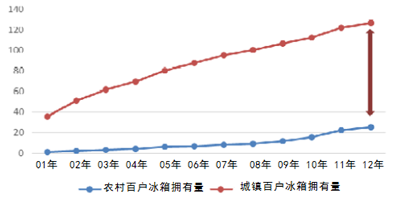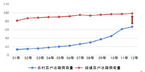 根據國家統計公報,在人均收入增長中, 2010-2013 年四年間農村居民收入相當于 2001-2004 年間城鎮居民收入水平,但這兩個時期城鄉居民對空調和冰箱的擁有量有很大差距,以 2012 年為例,農村居民收入相當于 2002 年城鎮居民收入水平, 2002 年城鎮居民每百戶空調和冰箱擁有量為 51.1 臺和 87.4 臺,但 2012年農村居民每百戶空調和冰箱擁有量為 24.4 臺和 67.3 臺,兩者差距較大。