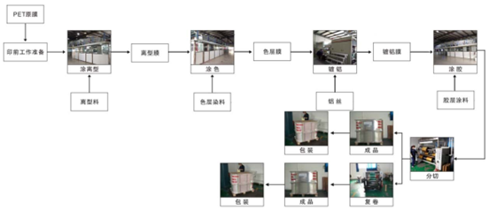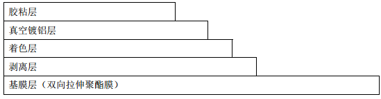 電化鋁一般由4~5層不同材料組成,如:基膜層(雙向拉伸聚酯膜)、剝離層、著色層、鍍鋁層、膠粘層。