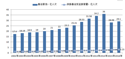 2002-2017年中國春運客流量及鐵路發送旅客量走勢