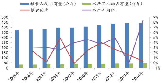 我國(guó)水產(chǎn)品人均占有量增長(zhǎng)快于糧食平均占有量