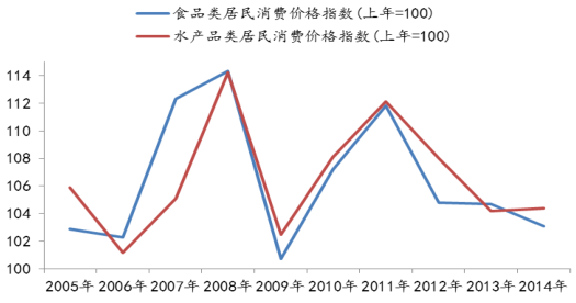 水產(chǎn)品需求仍具較大增長(zhǎng)空間。隨著城鄉(xiāng)居民收入水平的提高,其飲食結(jié)構(gòu)也逐步得到改善,“健康消費(fèi)”的理念迅速蔓延至全國(guó)各地以及各階層收入水平人群。水產(chǎn)品營(yíng)養(yǎng)高,不僅提供了高價(jià)值的蛋白,而且是廣泛的必需微量元素、礦物質(zhì)和脂肪酸的重要來(lái)源,因此日益受到消費(fèi)者的青睞,同時(shí)多數(shù)海珍品的消費(fèi)也開(kāi)始從“高端消費(fèi)”回歸至“大眾消費(fèi)”。2014 年國(guó)內(nèi)人均水產(chǎn)品占有量為 47.25 千克,較 2009 年增長(zhǎng) 22.95%,而同期人均糧食占有量增長(zhǎng) 11.61%,并且從兩者歷年同比變化情況來(lái)看,排除兩種產(chǎn)品的周期性干擾,可以得出水產(chǎn)品需求增長(zhǎng)快于糧食需求增長(zhǎng)的結(jié)論。另一方面,近年來(lái)水產(chǎn)品消費(fèi)價(jià)格指數(shù)除部分年份外基本高于食品類(lèi)平均消費(fèi)價(jià)格指數(shù),由此也可以反向推斷出水產(chǎn)品價(jià)格的提升主要是受水產(chǎn)品需求提振的影響。隨著人們健康理念的不斷增強(qiáng),消費(fèi)結(jié)構(gòu)的升級(jí),海洋食品尤其是海珍品等低碳環(huán)保的綠色食品的需求量仍然有較大的增長(zhǎng)空間。
