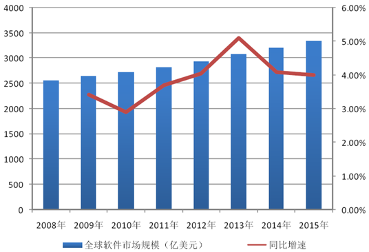 近年來,全球經濟形勢整體低迷,但軟件和信息技術服務的市場需求仍穩步增長。2015 年全球軟件市場規模達到3,336.68 億美元,2008 年至2015 年,全球軟件市場規模的年均復合增長率為3.89%,整體表現優于宏觀經濟。