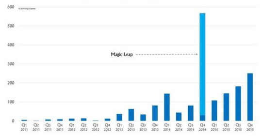 誘人的市場(chǎng)預(yù)期吸引了諸如 Facebook、Alphabet(谷歌)、蘋果、三星、HTC、索尼等 IT 巨頭以及動(dòng)視暴雪(ATVI)、迪士尼(DIS)等游戲動(dòng)漫制作公司在 VR 領(lǐng)域的大舉投入,虛擬現(xiàn)實(shí)成為了當(dāng)下一個(gè)非常熱門的投資領(lǐng)域。2014 年第四季度,Magic Leap 曾經(jīng)融資 5.42 億美元,谷歌和高通參與投資。據(jù) Digi-Capital 的報(bào)告顯示,投資者對(duì) VR/AR 領(lǐng)域的投資總額接近 7 億美元,連續(xù) 6 個(gè)季度增長(zhǎng),僅 2015 年第四季度就吸引了 2.5 億美元的投資,達(dá)到 2014 年的 6 倍。