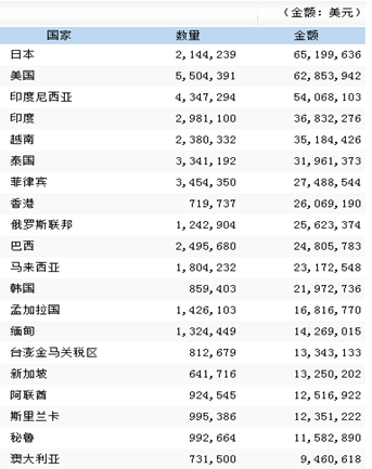 2015年我國電飯鍋進口貿易額前20國家及地區