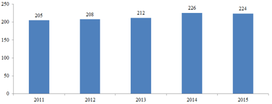 2011-2015 年全球液晶電視出貨量 (單位:百萬臺(tái))