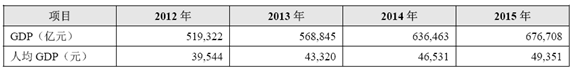 下表為2012 年至2015 年我國GDP、人均GDP 情況: