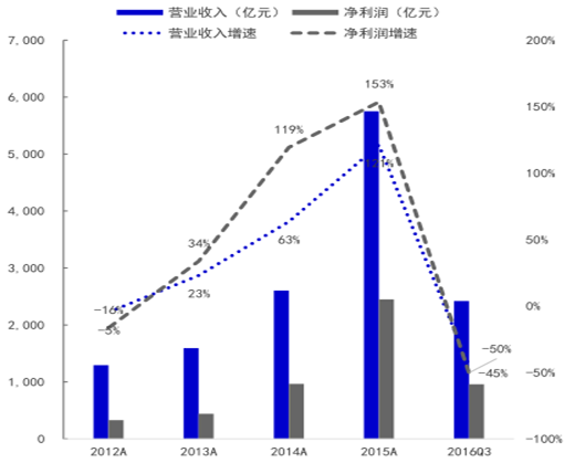 2011 年-2016 年Q3 證券行業營業收入與凈利潤