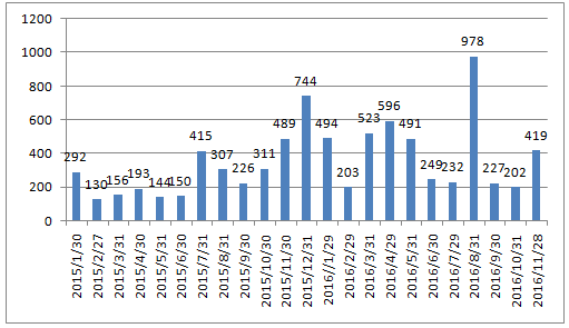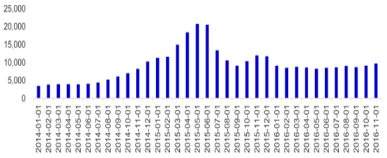 2014 年1 月-2016 年11月兩融余額變化(單位:億元)
