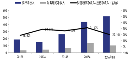 2016年上半年證券行業財務顧問凈收入為71.43億元,前三季度達到104.11億元。考慮到投行項目在年底確認收入較多,認為2016年全年財務顧問凈收入將達到153億元左右。按照10%的年度增速,預計2017年財務顧問凈收入達到168億元。