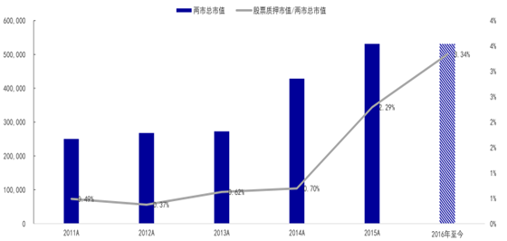2011 年-2016 年11月兩市總市值(億元)及股票質押業務質押市值占總市值比重
