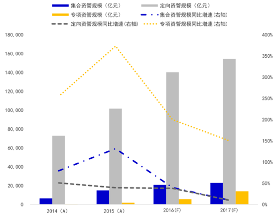 預計2017年集合資管、定向資管和專項資管規模同比增速分布為10%、10%和150%,對應規模分布為2.29萬億、15.42萬億和1.4萬億,整體規模將達到19.12萬億。