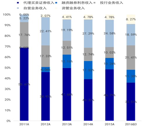 2011 年-2016 年Q3 證券行業經營收入構成情況