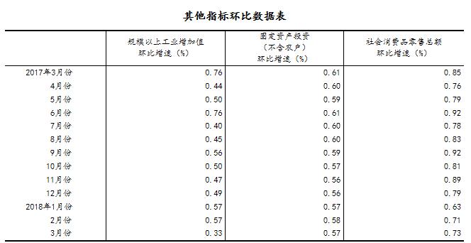 (2)根據季節調整模型自動修正結果,對近一年來各期國內生產總值、規模以上工業增加值、固定資產投資(不含農戶)、社會消費品零售總額環比增速進行修訂。修訂結果及2018年一季度GDP環比數據、3月份其他指標環比數據如下: