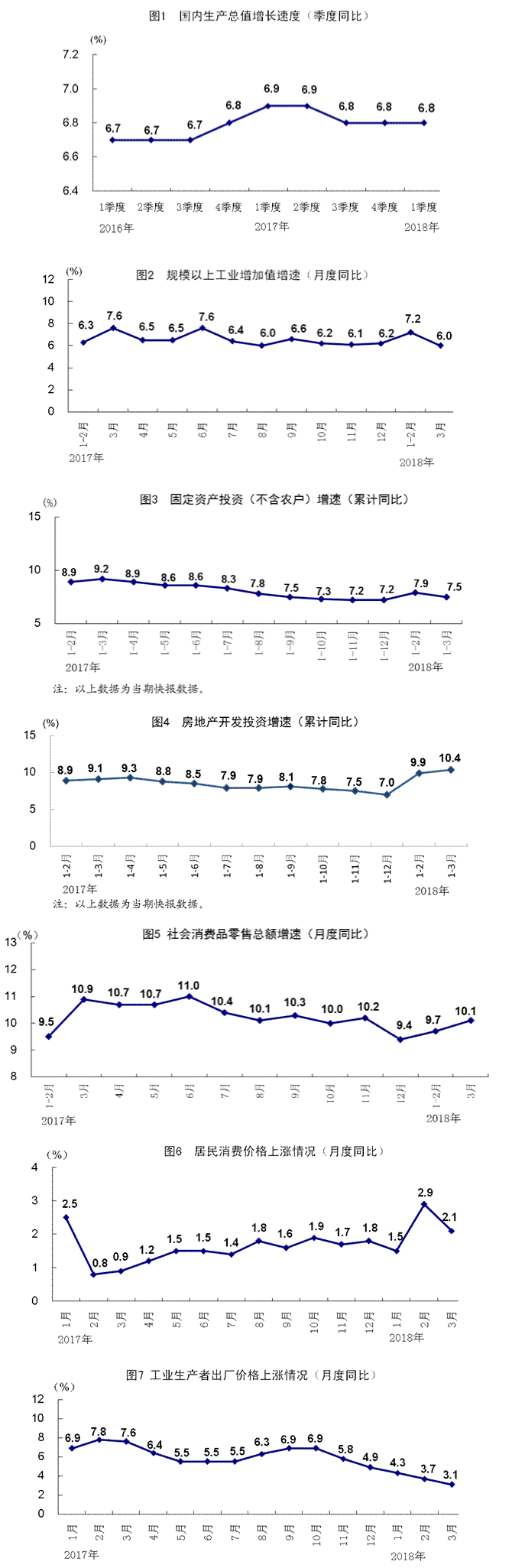 2017年各季度及2018年一季度GDP環比增速分別為1.5%、1.8%、1.8%、1.6%和1.4%。