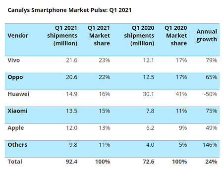 核心提示:根據數據機構Counterpoint所發布的調研報告顯示,在2021年的三月中旬,vivo在國內的市場份額達到了24%,位列國內第一。在今年,國內智能手機市場的競爭明顯加劇。尤其2021年第一季度,來自各大手機廠商的5G新機陸續登場,都參與到了愈發激烈的市場份額搶占大戰中。其中,多個國產手機品牌的表現依舊出色,尤其是國產品牌vivo,不僅在該季度實現了優秀的增勢表現,更在出貨量、銷售表現等方面,均有著不同程度的大幅提升!