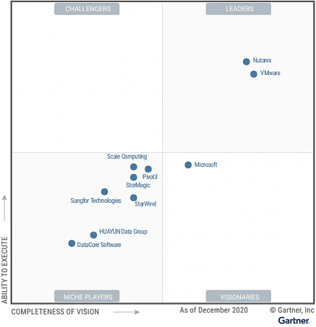 從公開資料看市場上主流的超融合廠家有華為、華云數據、深信服、VMware等。目前,雖然以一體機形式交付的超融合產品仍占據主要市場,但基于軟件的超融合產品被認為是超融合潛力最大的發展方向,Gartner因為認同該趨勢而修改了2020年超融合魔力象限的入選標準:只包括可以提供虛擬化計算、虛擬化存儲和網絡以及管理的軟件提供商,而且,這些軟件可以運行在多種不同硬件。因而,將超融合軟件只能運行在自家硬件上的超融合排除在外了,直接導致華為掉出了2020年魔力象限,只留下兩家中國廠商,分別是華云數據和深信服。