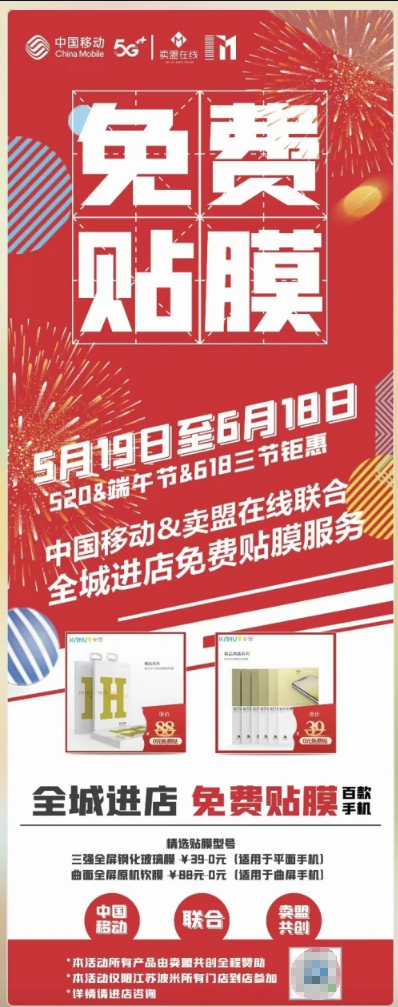 不斷創(chuàng)造,驚喜連連。五月佳期,賣盟在線 520牽手無(wú)錫中國(guó)移動(dòng)!這也讓賣盟在線無(wú)比喜悅,所以在5月19日至6月18日,賣盟在線將聯(lián)合中國(guó)移動(dòng)開(kāi)啟520、端午節(jié)以及613三節(jié)鉅惠,全城進(jìn)店免費(fèi)貼膜!百款手機(jī),精選貼膜型號(hào),如果您的手機(jī)屬于平面手機(jī),我們有三強(qiáng)全屏鋼化玻璃膜(價(jià)值39元)免費(fèi)為您提供,如果屬于曲屏手機(jī),我們也有曲面全屏原機(jī)軟膜(價(jià)值88元)免費(fèi)給您!如果了解賣盟在線,相信您已經(jīng)行動(dòng)。如果不了解賣盟在線,趕緊行動(dòng),去體驗(yàn)賣盟在線帶給您的生活小驚喜!