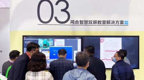 展會現場,鴻合智慧雙屏教室解決方案引發一眾圍觀,不少教師表示,一塊屏幕已經難以滿足現在日漸多元化的授課內容和方式,學生們也說,影像素材和PPT來回轉換會引起思維混亂。鴻合雙屏應用教室解決方案無縫組合兩塊鴻合高職教智能交互平板,既相互獨立又相輔相成:多媒體素材展示和板書可在兩塊屏分別呈現,并支持一鍵左右屏切換;同一個PPT和word也可在兩塊屏同步顯示、上下頁聯動。為教師提供多元內容展示手段和方式,為學生提供更連貫、更結構化的知識輸出。雙屏大視角也更適配高校的階梯大教室。