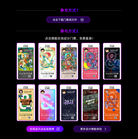 完成設計后,參與者將原創作品發布在微博上,由網友們點贊評選,而在線設計的獲獎作品則是隨機抽取產生。優勝參與者將獲得2021 Alibaba Design Week展會通票、Usee藝術設計展門票和稿定設計會員。