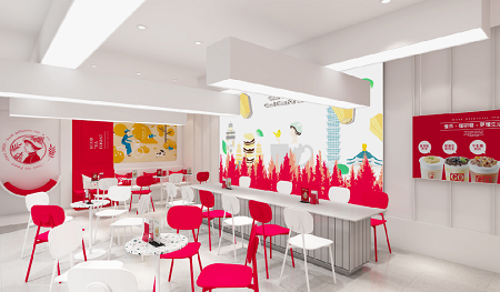 紅色店面對消費者的吸引力高于其他顏色,在窗擋玻璃、吧臺、座椅等區域使用紅色色塊設計,可以增強環境渲染力,帶給消費者更強的產品感受力,有助于提升品牌形象,加深品牌印象,促進品牌宣傳推廣。