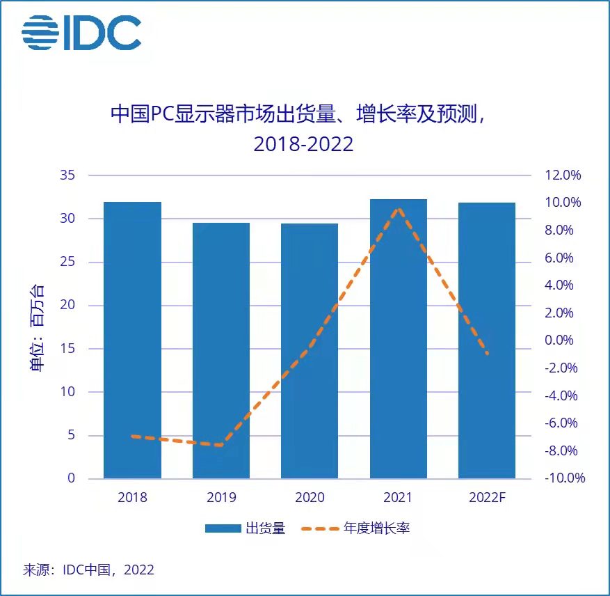 對于中國市場,IDC報告數據顯示,2021年第四季度,中國PC顯示器市場出貨量816萬臺,同比下滑2%。2021年全年中國PC顯示器市場出貨3231萬臺,同比增長9.7%,創十年來最高增幅。