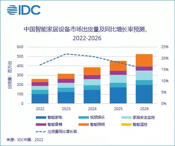 IDC認為,雖然市場在供需雙方壓力之下并未出現兩位數的反彈,但出貨體量背后不可忽視的是中國智能家居市場的升級和調整。在不斷的優化中,市場將迎來新的發展機會,預計2022年中國智能家居設備市場出貨量將突破2.6億臺,同比增長17.1%。
