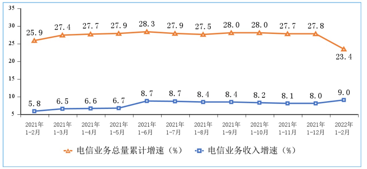 核心提示:近日,工信部發布《2022年1-2月份通信業經濟運行情況》。根據報告,前兩月我國電信業務收入增速提升,電信業務總量保持增長。 1-2月份,電信業務收入累計完成2586億元近日,工信部發布《2022年1-2月份通信業經濟運行情況》。根據報告,前兩月我國電信業務收入增速提升,電信業務總量保持增長。
