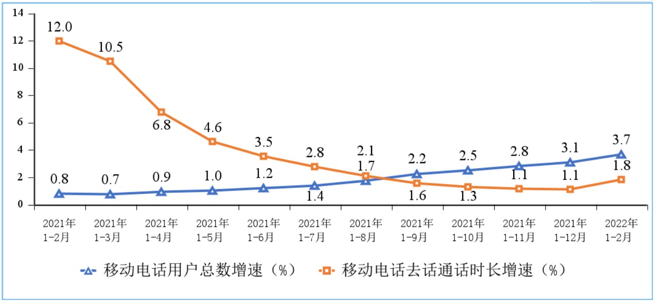 2021-2022年1-2月份移動電話用戶增速和通話時長增速情況