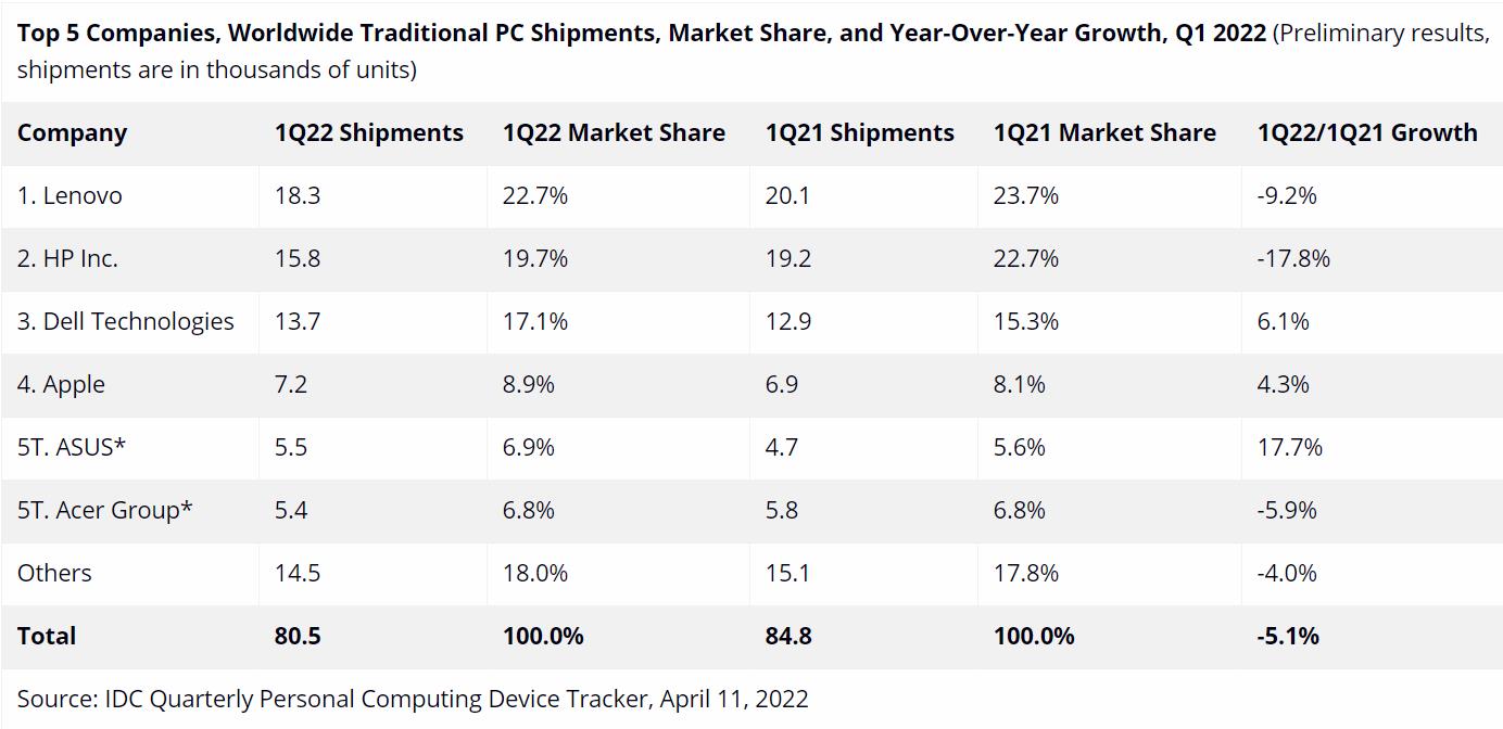 與2021年第四季度相比,2022年第一季度在領先供應商中的排名保持不變。聯想以22.7% 的市場份額位居榜首,其次是惠普、戴爾和蘋果。華碩和宏基在一季度并列第五。戴爾、蘋果和華碩是僅有的幾家出貨量同比增長的領先廠商。由于持續的供應鏈短缺,以及與強勁的第一季度相比具有挑戰性,筆記本電腦出貨量出現了同比下降,而臺式電腦略有增長。