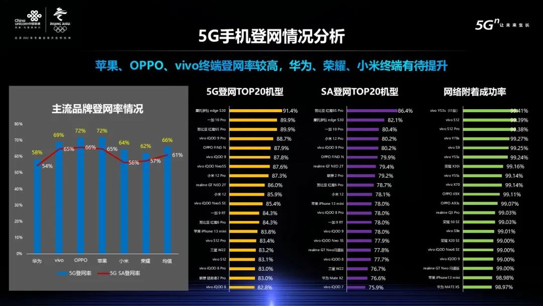 5G手機登網情況分析顯示,蘋果、OPPO、vivo終端登網率較高,分別為72%、72%、69%,華為、榮耀、小米終端登網率分別為58%、62%、64%,有待提升。