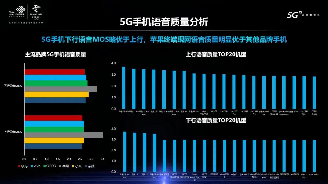 5G手機語音質量分析數據顯示,5G手機下行MOS略優于上行,蘋果終端現網語音質量明顯優于其他品牌手機。