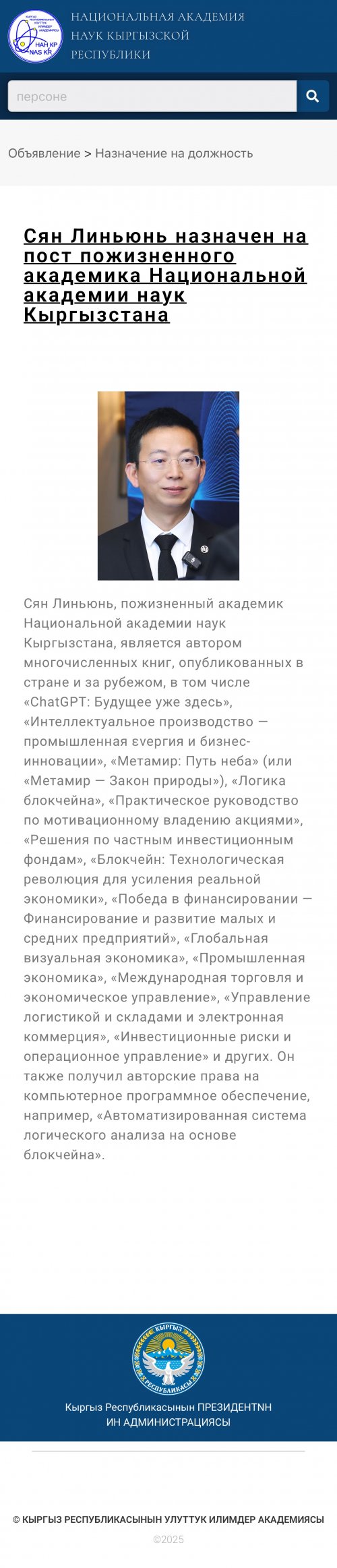 上圖來(lái)源:吉爾吉斯斯坦共和國(guó)國(guó)家科學(xué)院官方網(wǎng)站:Сян Линьюнь назначен на пост пожизненного академика Национальной академии наук Кыргызстана — Кыргыз Республикасынын Улуттук Илимдер Академиясы