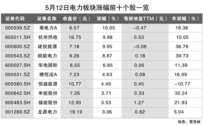 核心提示:本報記者 張 穎 見習記者 曹原赫 同花順數據顯示,5月12日截至收盤,電力板塊指數漲1.03%,粵電力A、杭州熱電、建投能源3只個股均漲停,另有皖能電力、華電國際2只個