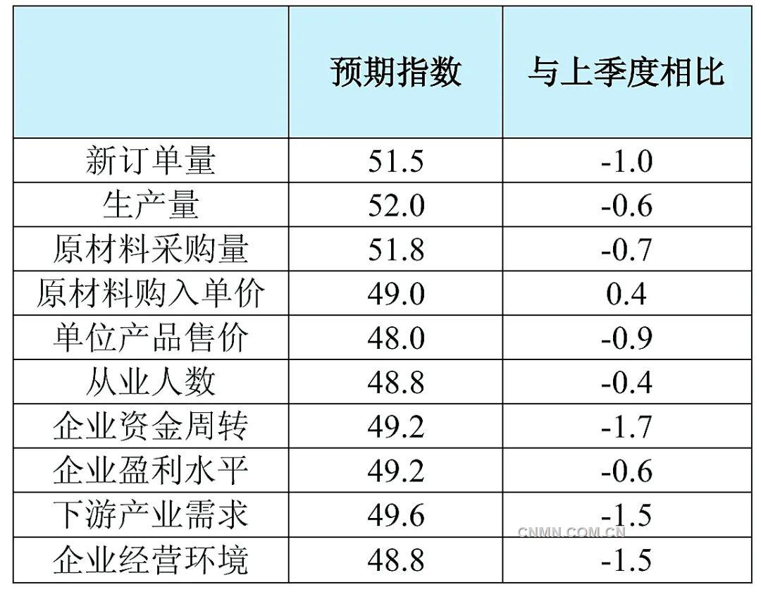 本期,預期指數為49.7,較上期回落0.8個點。由表2可知,10項指標中共有新訂單量、生產量等3項指標高于臨界點50,本期共有8項指標出現回落。本季度預期指數,降幅較明顯的前3名分別是:企業資金周轉、下游產業需求和企業經營環境,其降幅分別是1.7、1.5和1.5個點。