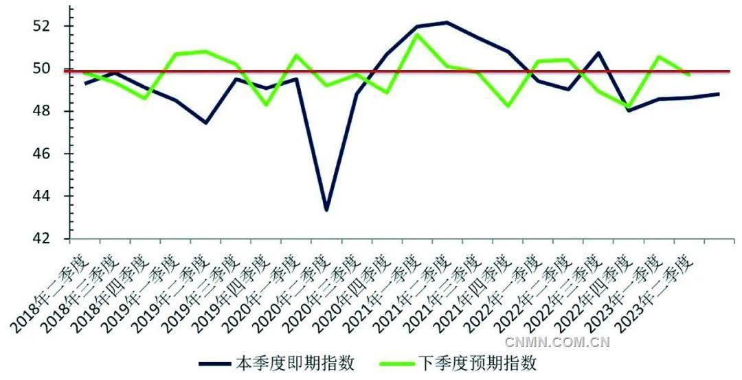 核心提示:2023年二季度,有色金屬企業信心指數為49.4,比上季度回落0.4個點,并低于臨界點50。本期即期指數為48.8,較上期上升0.2個點;預期指數為49.7,較上期回落0.2023年二季度,有色金屬企業信心指數為49.4,比上季度回落0.4個點,并低于臨界點50。本期即期指數為48.8,較上期上升0.2個點;預期指數為49.7,較上期回落0.8個點。兩項比較,預期指數超過即期指數0.9個點,說明前者稍好于后者,具體情況詳見圖1和圖2。