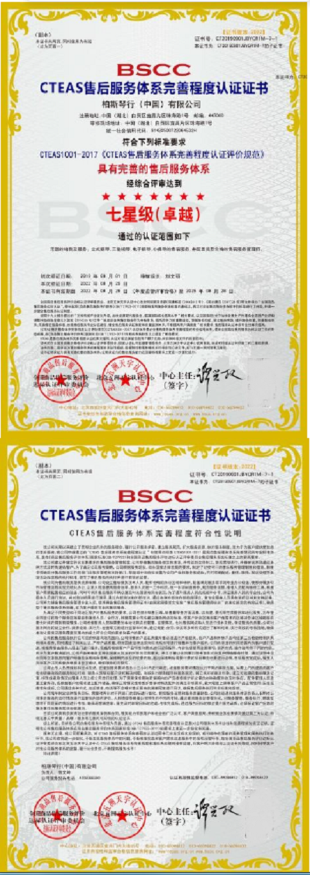 柏斯琴行榮獲CTEAS售后服務(wù)體系完善程度認(rèn)證——七星(卓越)認(rèn)證