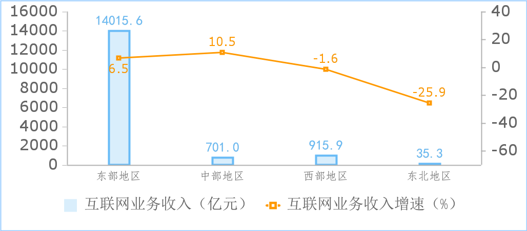 中部地區(qū)互聯(lián)網(wǎng)業(yè)務(wù)收入增速持續(xù)提升。1-11月份,東部地區(qū)完成互聯(lián)網(wǎng)業(yè)務(wù)收入14016億元,同比增長(zhǎng)6.5%,增速與1-10月份持平,高于全國(guó)增速0.4個(gè)百分點(diǎn),占全國(guó)互聯(lián)網(wǎng)業(yè)務(wù)收入的比重為89.5%。中部地區(qū)完成互聯(lián)網(wǎng)業(yè)務(wù)收入701億元,同比增長(zhǎng)10.5%,增速較1-10月份提升4個(gè)百分點(diǎn),高于全國(guó)增速4.4個(gè)百分點(diǎn)。西部地區(qū)完成互聯(lián)網(wǎng)業(yè)務(wù)收入915.9億元,同比下降1.6%,降幅較1-10月份擴(kuò)大0.2個(gè)百分點(diǎn)。東北地區(qū)完成互聯(lián)網(wǎng)業(yè)務(wù)收入35.3億元,同比下降25.9%,降幅較1-10月份收窄3.2個(gè)百分點(diǎn)。