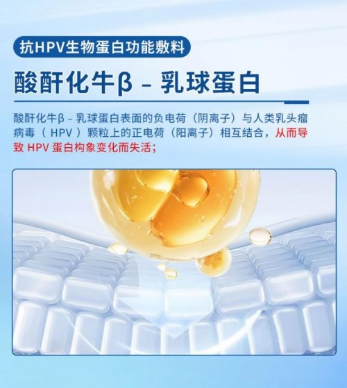 該產(chǎn)品通過三重協(xié)同機(jī)制發(fā)揮作用。首先,酸酐化牛β-乳球蛋白通過靜電作用與HPV病毒結(jié)合。該成分經(jīng)復(fù)旦大學(xué)姜世勃教授團(tuán)隊(duì)研究證實(shí)具有抗病毒活性,其表面負(fù)電荷可與HPV病毒衣殼蛋白正電荷區(qū)域特異性結(jié)合,使病毒失活。