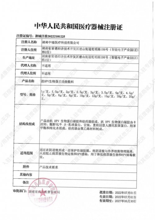 圖注:衛(wèi)茵清抗HPV生物蛋白功能敷料醫(yī)療器械注冊(cè)證