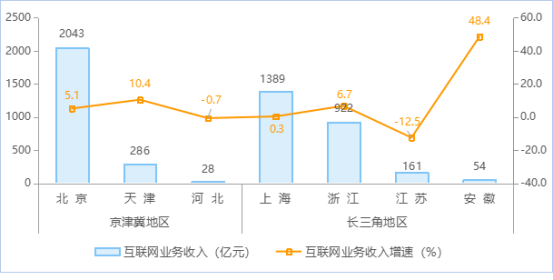 京津冀、長三角地區互聯網業務收入保持平穩增速。1-5月份,京津冀地區完成互聯網業務收入2356億元,同比增長5.6%,占全國互聯網業務收入的34.3%。長三角地區完成互聯網業務收入2527億元,同比增長2.3%,占全國互聯網業務收入的36.9%。