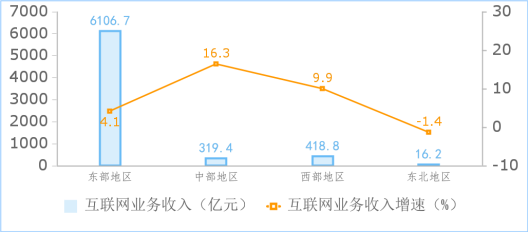 中部地區互聯網業務收入保持較高增速,東北地區收入降幅減小。1-5月份,東部地區完成互聯網業務收入6107億元,同比增長4.1%,低于全國增速0.9個百分點,占全國互聯網業務收入的89%。中部地區完成互聯網業務收入319.4億元,同比增長16.3%,高于全國增速11.3個百分點。西部地區完成互聯網業務收入418.8億元,同比增長9.9%,高于全國增速4.9個百分點。東北地區完成互聯網業務收入16.2億元,同比下降1.4%,低于全國增速6.4個百分點。