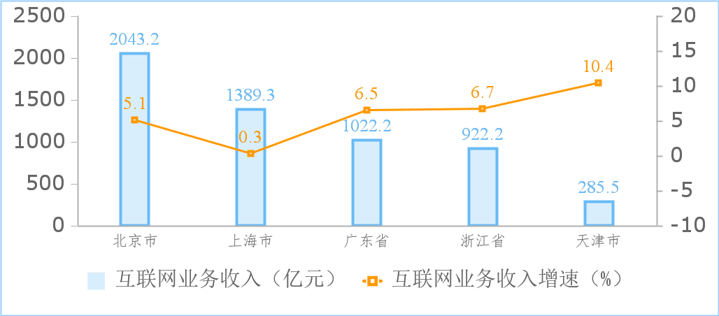 超半數地區互聯網業務實現正增長。1-5月份,互聯網業務累計收入居前5名的北京(增長5.1%)、上海(增長0.3%)、廣東(增長6.5%)、浙江(增長6.7%)和天津(增長10.4%)共完成業務收入5662.5億元,同比增長2.8%,占全國(扣除跨地區企業)互聯網業務收入的82.5%。全國互聯網業務收入實現正增長的省(區、市)有17個,其中甘肅、安徽增速超40%,新疆、西藏、吉林降幅超30%。