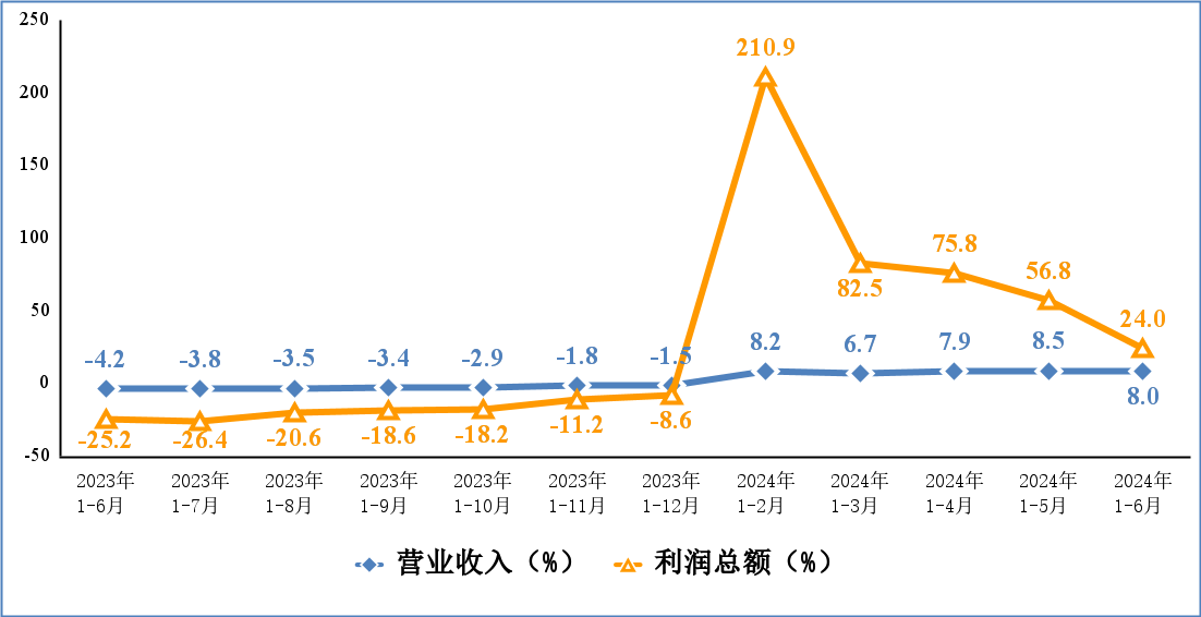 上半年,規模以上電子信息制造業實現營業收入7.37萬億元,同比增長8%,較1-5月份降低0.5個百分點;營業成本6.41萬億元,同比增長7.4%;實現利潤總額2942億元,同比增長24%;營業收入利潤率為3.99%,較1-5月份增加0.7個百分點。6月份,規模以上電子信息制造業營業收入1.41萬億元,同比增長5.6%。